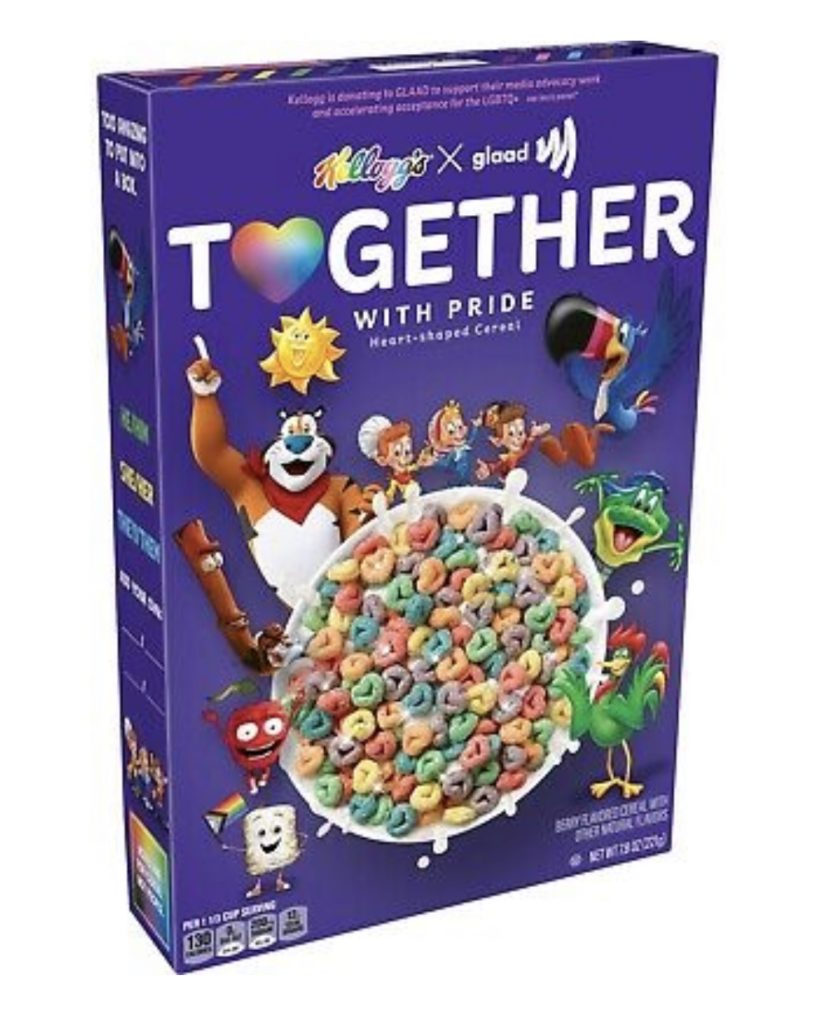 The cereal packaging is co-branded with the predatory homosexual organization GLSEN, is manufactured by Kellogg’s, and appropriates the symbol of the rainbow in order to promote homosexuality with a Kellogg’s mascot designed to appeal to young children, like Camel Cigarettes. It’s called “Together With Pride,” because that’s exactly what the homosexuals of GLSEN and the predatory organization is pushing as an acceptable behavior with and between young American children.
