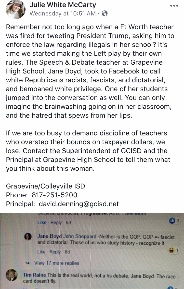 (Texas) Contact the Superintendent of Grapevine ISD David Denning and tell him it’s not cool for the Speech and Debate teacher to tell students what to argue but how to argue.