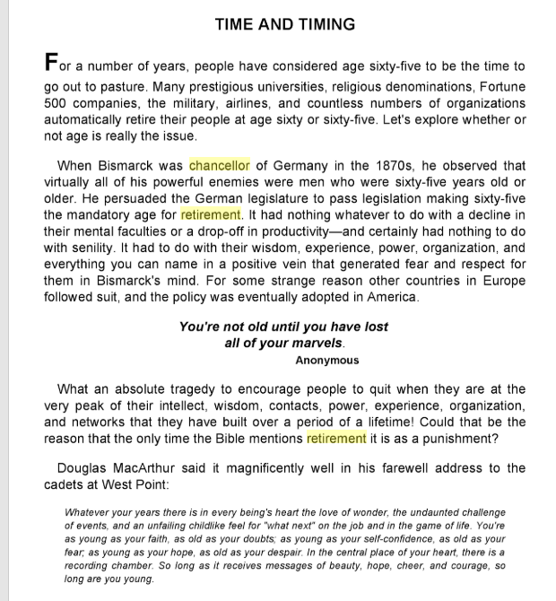 The late, great, “Zig” Ziglar, who perhaps articulated, if not epitomized the spirit of American success more than anyone else in the 20th century and beyond, said that it was a German Chancellor who instituted the concept of retirement, and he did so because he wanted to put his wisest, most connected political opponents out to pasture, and the world has been doing the same thing ever since.