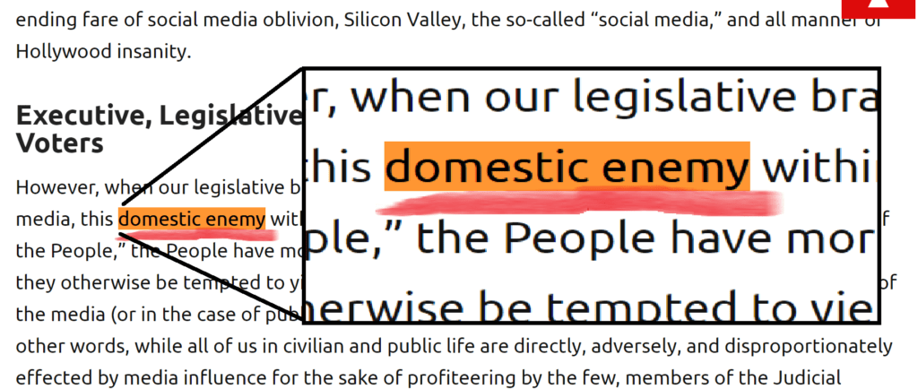 However, when our legislative branch and Executive branches’ necks are turned by this American media, this domestic enemy within, which President Trump has rightly identified as the “Enemy of the People,” the People have more direct power to hold those other branches accountable, lest they otherwise be tempted to yield to the technology-driven, largely shareholder-driven, whims of the media (or in the case of public media, partisan, directly government-controlled “whims”).